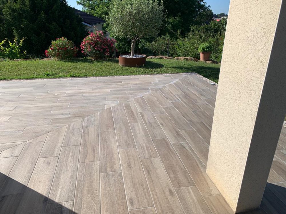 À Mâcon, Puget Carrelage a réalisé une magnifique terrasse en carrelage effet bois. Ce choix combine l’esthétique chaleureuse du bois avec la durabilité et l’entretien facile du carrelage. Le carrelage effet bois est adapté pour les espaces extérieurs, offrant une résistance aux intempéries tout en créant une ambiance naturelle et accueillante.